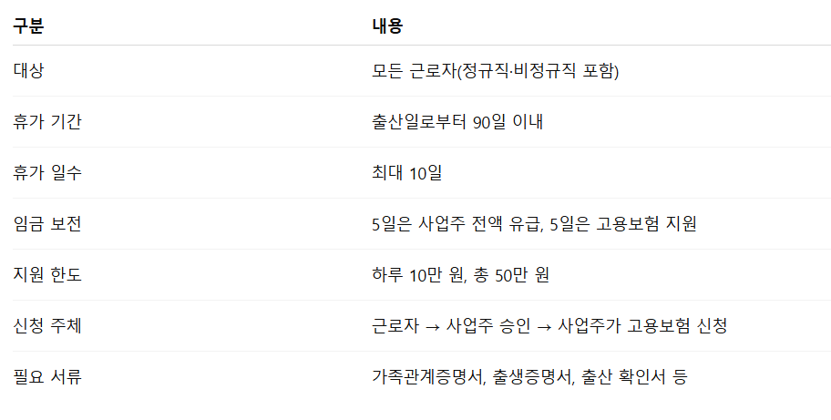 - 휴가 일수: 최대 10일(5일 유급 + 5일 고용보험 지원)