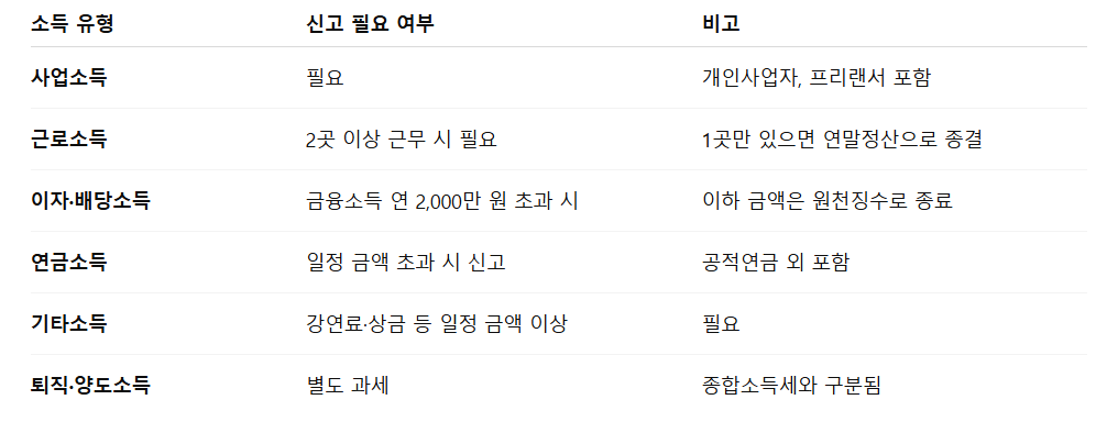 즉, 개인사업자·프리랜서·투잡 근로자는 반드시 종합소득세 신고기간에 신고해야 하며, 금융소득·연금·기타소득이 일정 기준을 넘는 경우도 포함됩니다.