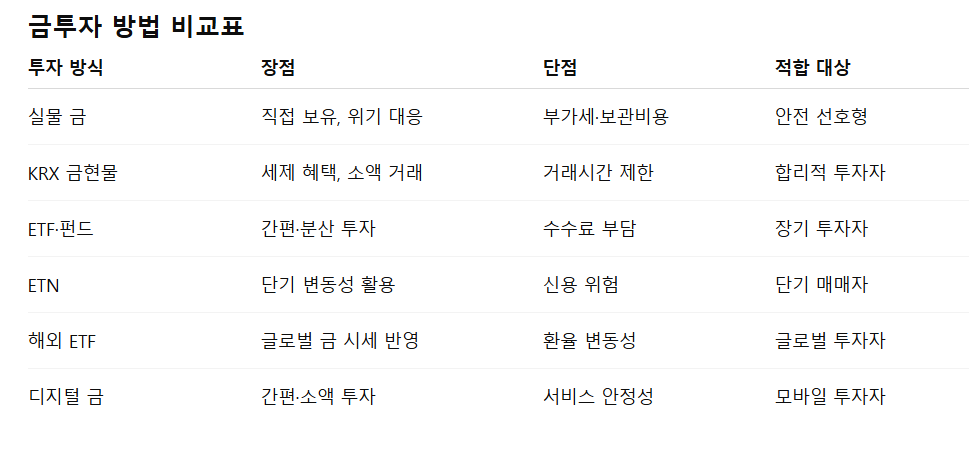 📌 장기적으로 금 가격 상승을 기대한다면 ETF·펀드가, 단기 변동성을 활용하려면 ETN이 더 적합합니다.