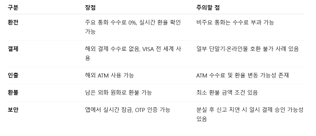 트레블월렛 카드는 해외 결제의 불편함을 크게 줄여주는 혁신적인 서비스입니다. 다만, 실제 사용 시 아래와 같은 장단점을 명확히 이해하는 것이 중요합니다.