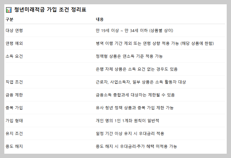 청년미래적금의 가입조건은 주로 연령 요건과 소득 요건으로 구성됩니다.
