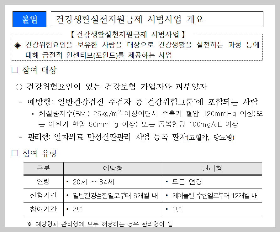 관리형은 진료비 결제 시 포인트 자동 차감이 가능하고, 예방형은 시범사업 지역 확대에 따라 참여 기회가 늘어났다.