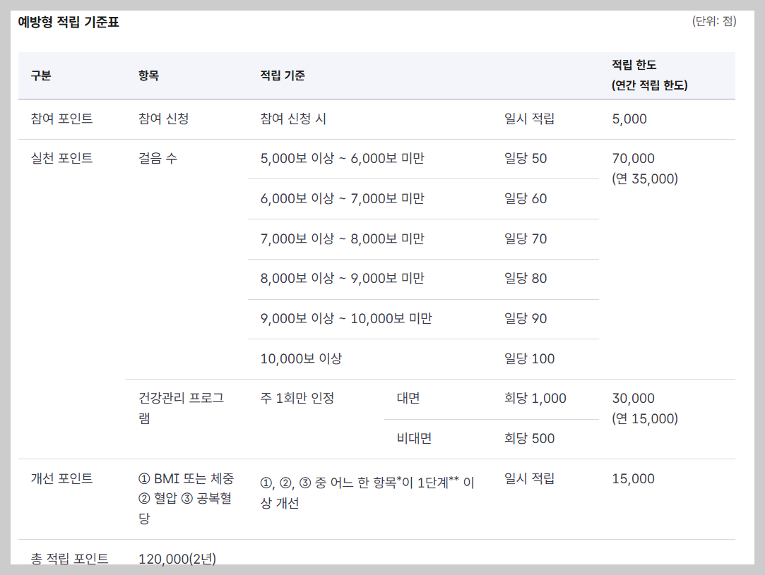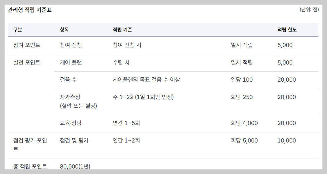 고혈압·당뇨병 환자 또는 건강위험군이 대상이며, 걷기와 건강관리 활동을 수행하면 포인트가 적립된다.
