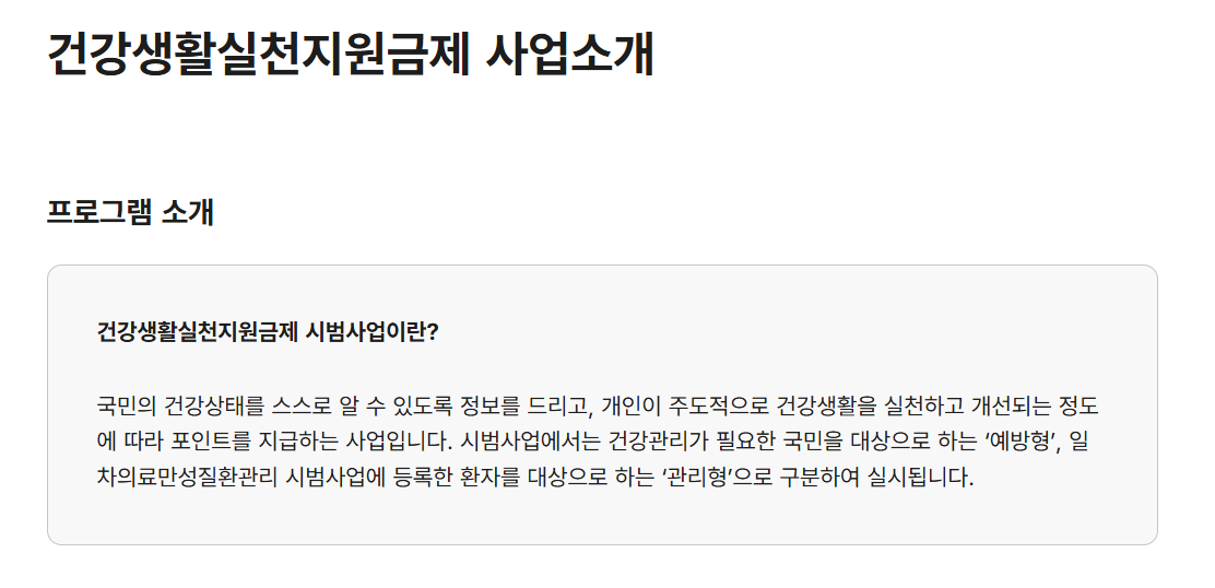 이 제도는 고혈압·당뇨병 환자와 건강위험요인을 가진 국민을 대상으로, 걷기 실천과 건강관리 활동을 수행하면 포인트를 적립해 주는 방식으로 운영된다.
