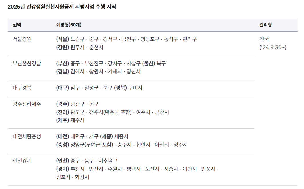 2025년 기준 예방형은 시범사업 지역이 기존 15개 지역에서 50개 지역으로 확대되었다. 대상자는 국민건강보험공단이 발송하는 개별 알림톡을 통해 참여 안내를 받는다.