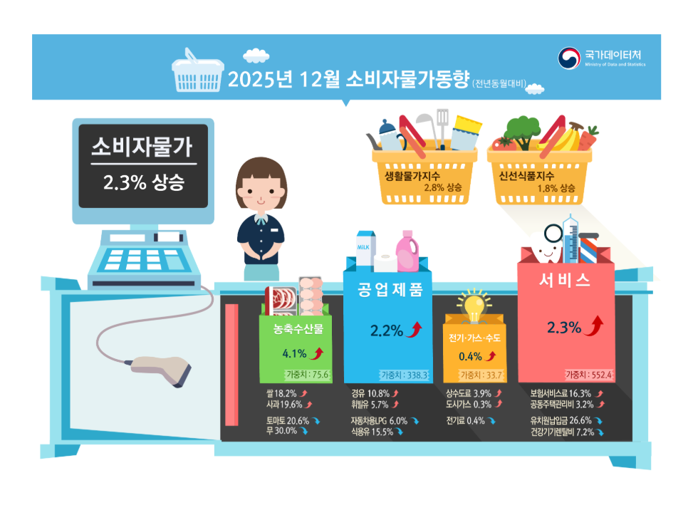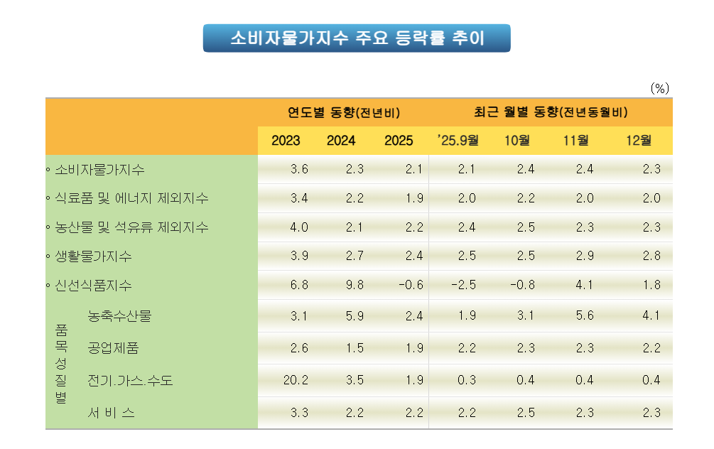 2026년 현재 발표된 공식 통계를 보면 소비자물가 상승률은 2025년 12월 기준 전년 동월비 약 2.3%로 나타났습니다.