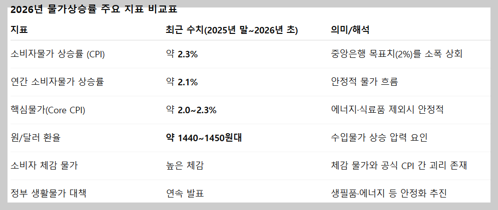 2026년 물가상승률 관련 주요 지표 비교