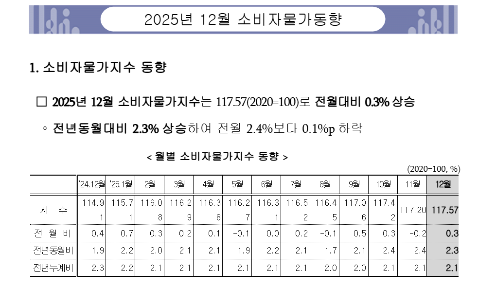 → 현재 발표된 공식 통계에 따르면 2025년 12월 소비자물가 상승률은 약 2.3%로 나타났습니다. 이는 중앙은행 목표치 2%를 소폭 상회하는 수준입니다.